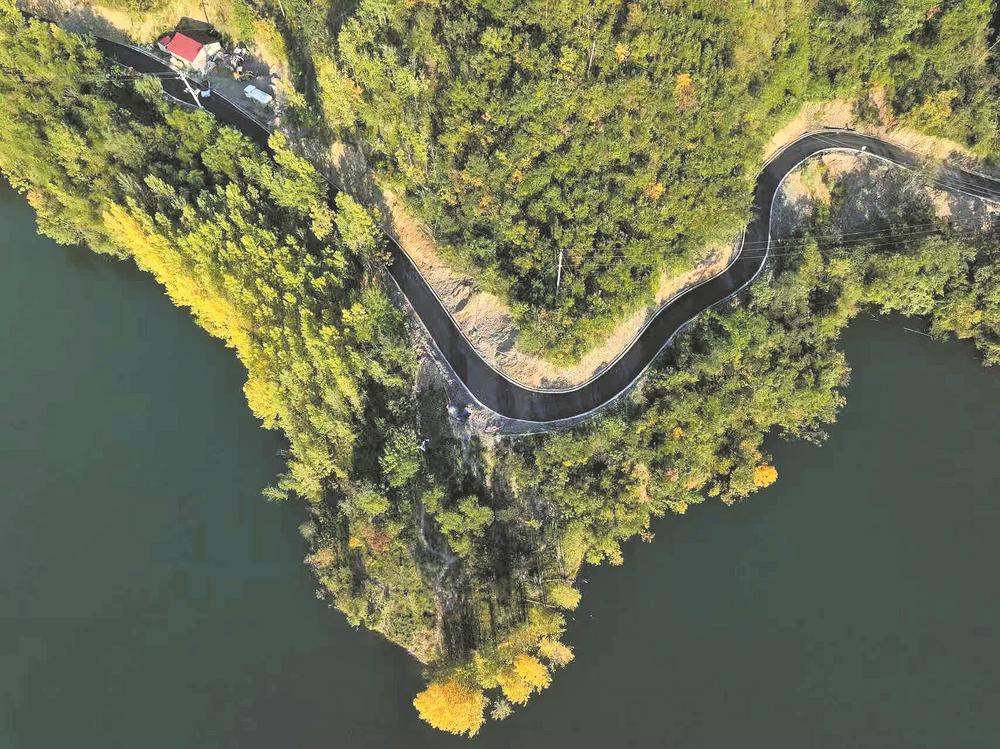 10月30日,在保康县寺坪镇天子湖畔拍摄的刚刷黑的环库公路。寺坪镇环库公路全长47.04公里,串联大畈、七里扁等11个行政村,是围绕天子湖水库打造的“生态路+便民路”。
