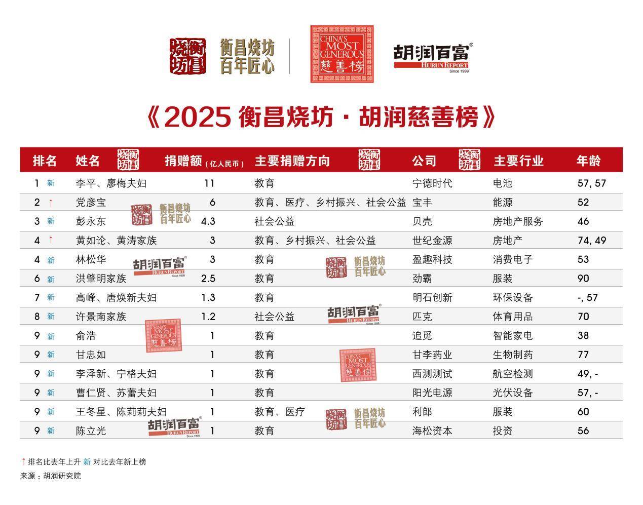 湖北日报讯(记者肖丽琼)11月4日,胡润研究院发布《2025衡昌烧坊·胡润慈善榜》。榜单统计了2024年9月1日至2025年8月31日期间中国企业家及个人的现金、股权捐赠以及有法律效力的承诺捐赠,14位慈善家上榜。值得关注的是,在未计入本次榜单的大额捐赠中,华中科技大学获得一笔1.8亿元的校友匿名捐赠引发关注。