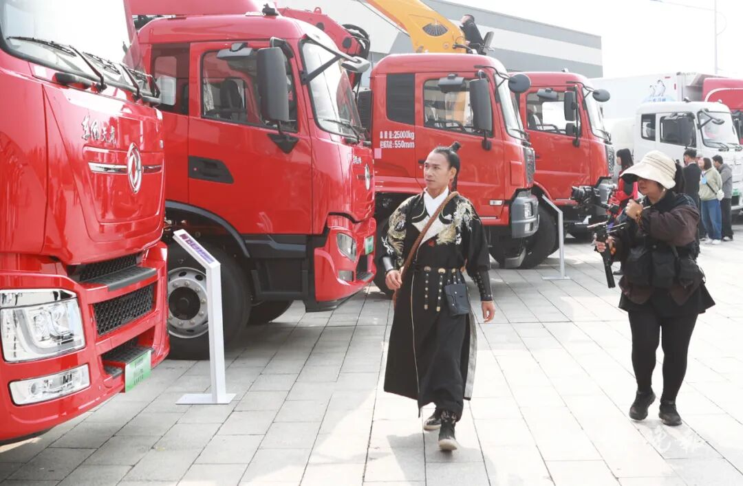 主播们现场拍摄东风商用车旗下东风天龙车型。(图源:十堰晚报)