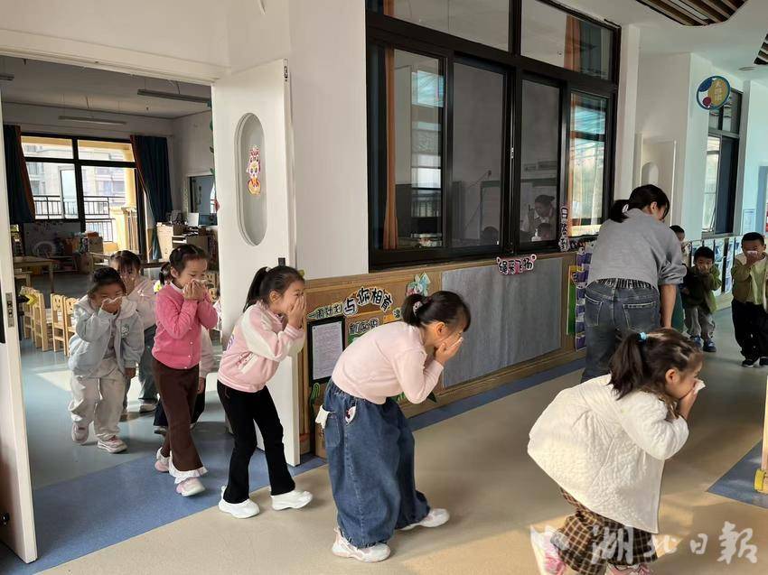 上午9时30分,急促的消防警报声划破校园的宁静,演练正式拉开序幕。听到警报后,各班教师迅速行动,立即组织幼儿用湿毛巾捂住口鼻,弯腰低姿,沿着安全通道快速、有序地向操场空旷地带撤离。撤离过程中,孩子们听从指挥,不推不挤,在教师的护送下,短短3分钟内,全体师幼便安全抵达指定集合点。随后,各班教师迅速清点人数,并向演练总指挥汇报,确保无一人遗漏。