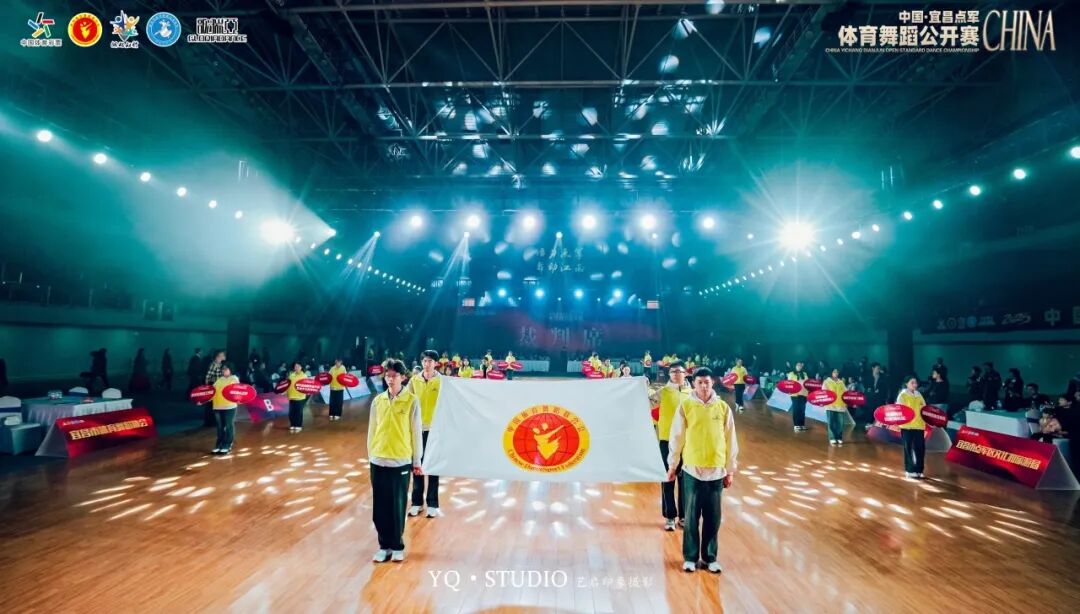在震撼的灯光秀中,中国体育舞蹈联合会会旗与各参赛代表队队牌依次入场,现场气氛庄重而热烈。