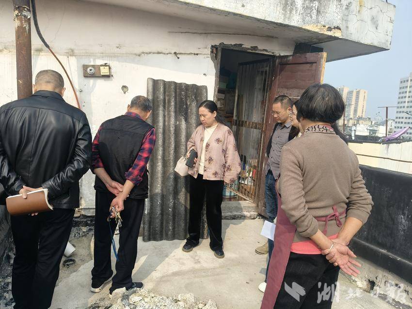 随后,代表们赴现场查看顶楼拆违及修复情况,实地了解违建拆除后的场地平整、防水处理等修复进展。针对拆后维护管理,代表们提出三点建议:一是建立“街道牵头、物业负责、居民监督”的长效管护机制,压实日常巡查责任;二是优化修复标准,结合实际完善防水、排水等配套设施;三是加强宣传引导,提升居民公共空间保护意识,从源头遏制违建风险。