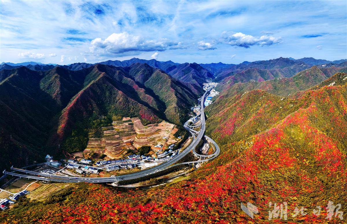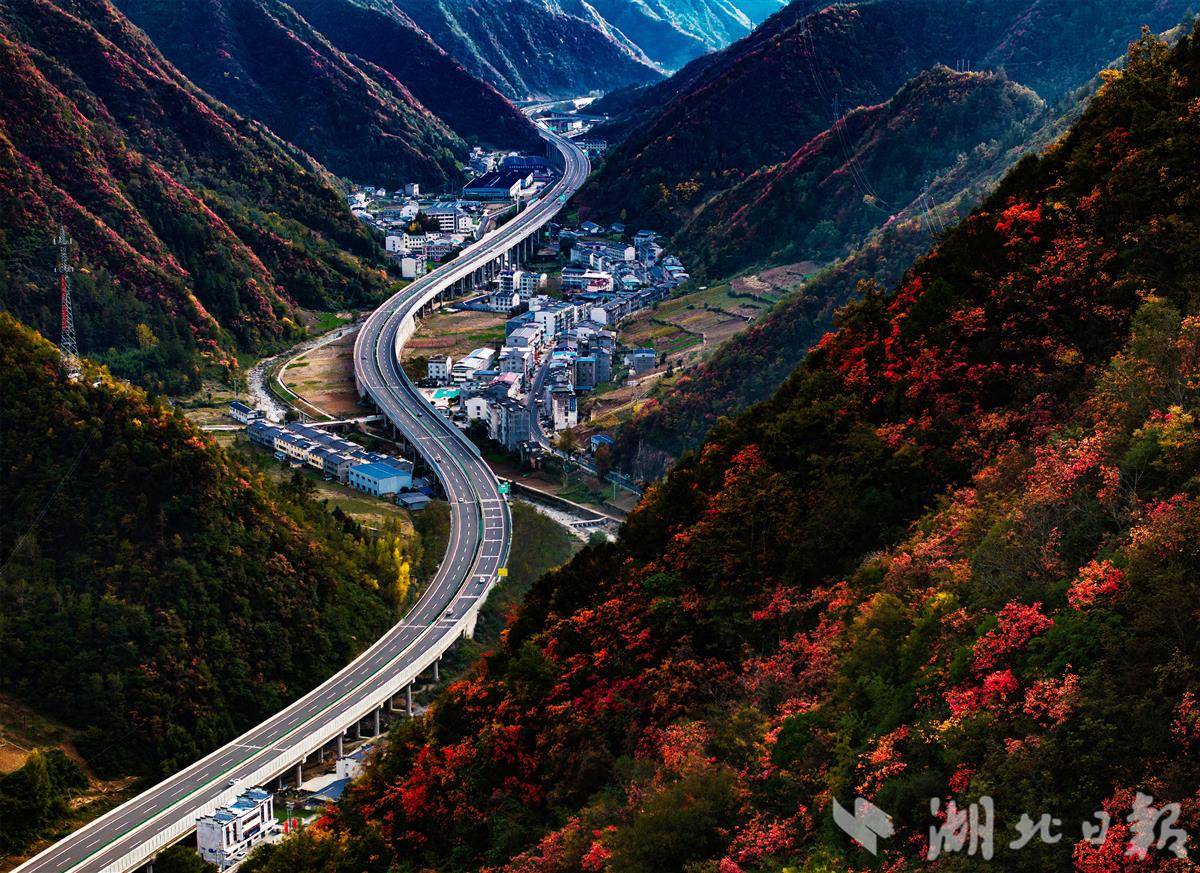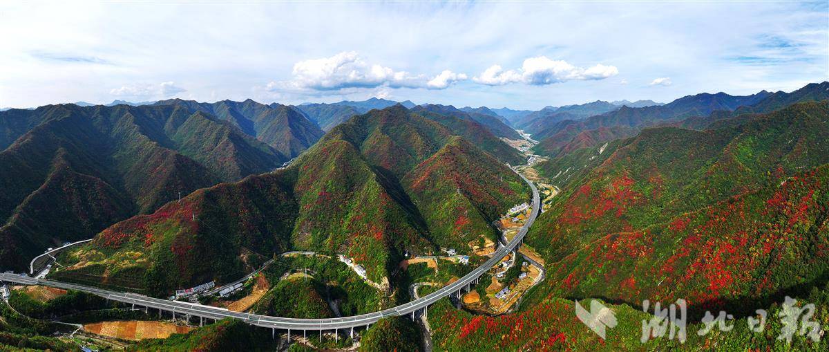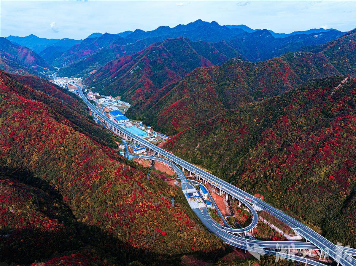 11月2日,竹山县双台乡万山丛中,黄栌树、枫树、槭树、黄楝树等落叶树的叶子由绿变黄、变红、变褐,夹杂在常绿树木之间,将山体染成五彩斑斓的画卷。登高远眺,G242国道与十巫(十堰-巫溪)高速如两条黑丝带结伴穿行于层林尽染的群山。车流如梭,在五彩的秋色中“绘”出“路在景中、景随路延”的生态交通新图景。