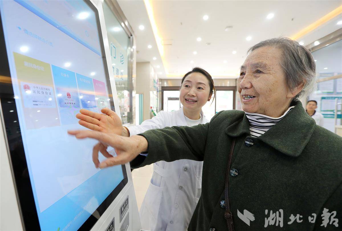 11月3日,荆门市东宝区龙泉社区卫生服务中心内,患者在医护人员引导下,通过自助服务一体机体验从挂号、缴费到报告查询的全流程“无纸化就医”服务。