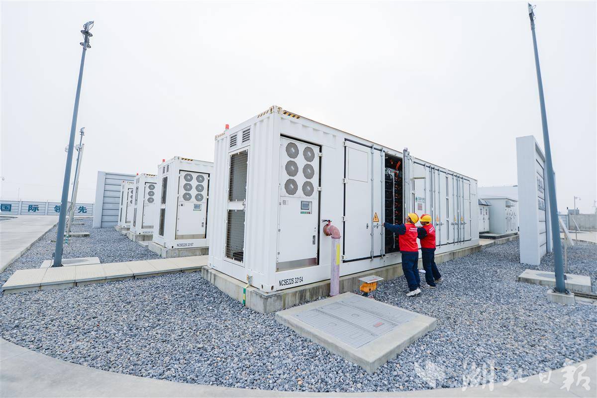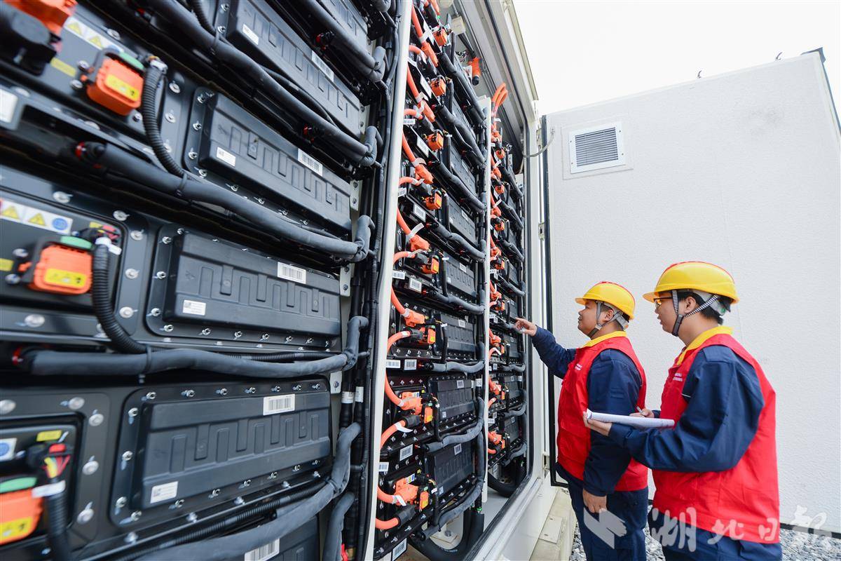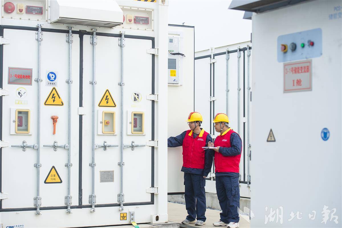 11月3日,荆门市沙洋县,国网荆门供电公司变电运维人员对新港储能电站电池整流舱、升压舱、消防系统等关键设备进行细致检查,确保设备安全稳定运行。