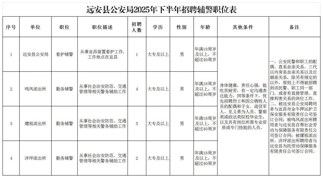 一、招聘岗位及职数本次招聘辅警12名,招聘职位相关要求详见《远安县公安局2025年下半年招聘辅警职位表》。