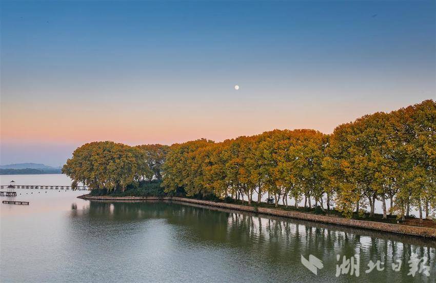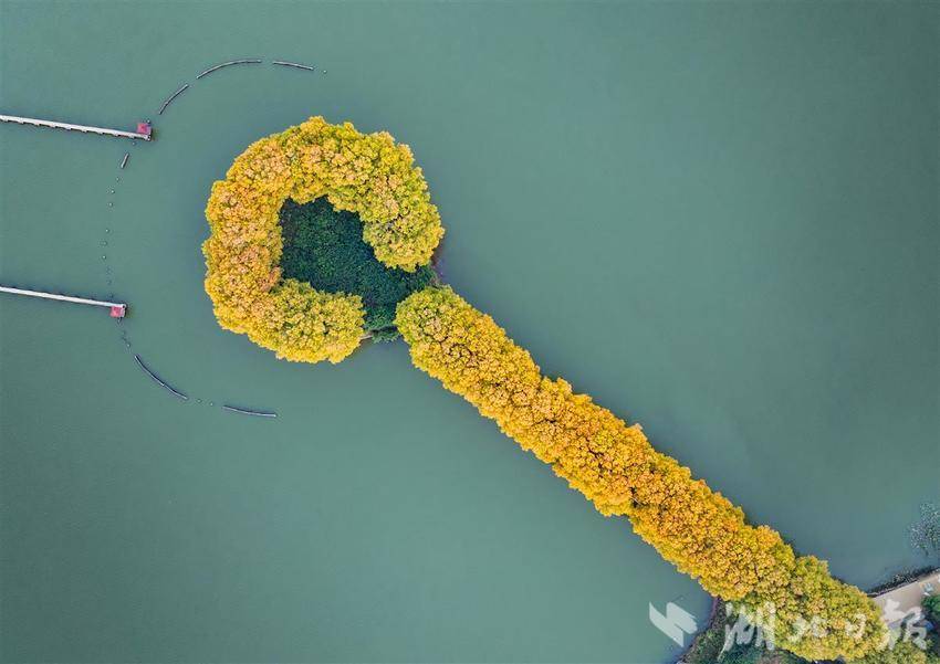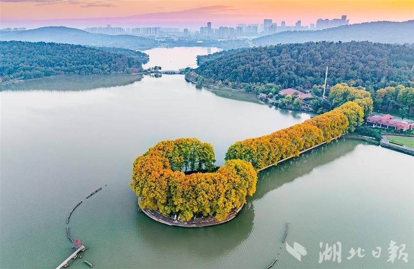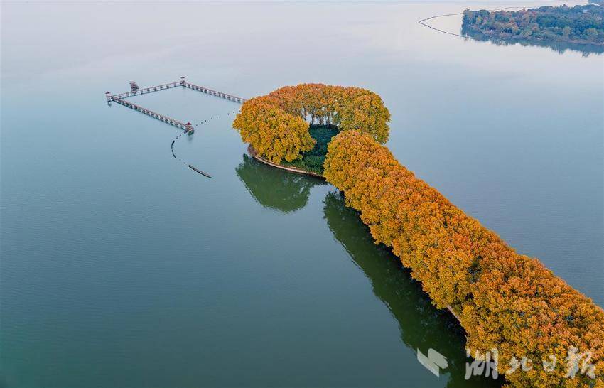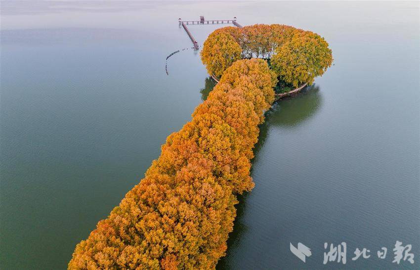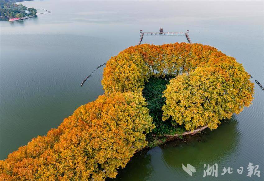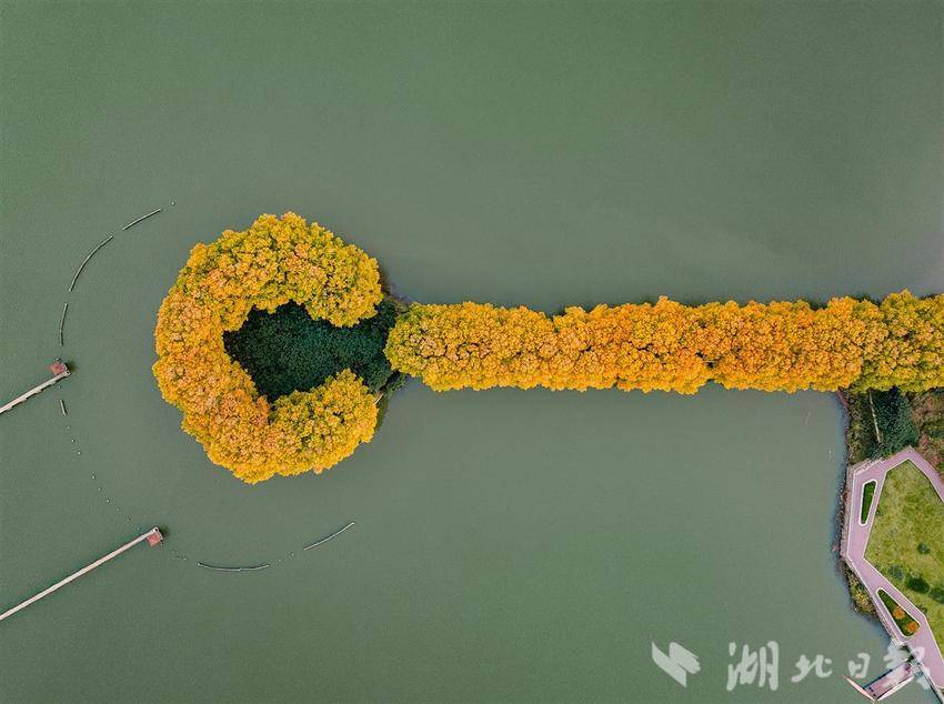 近日,武汉东湖风景区的“金钥匙”景点迎来了最美的时刻。从空中俯瞰,这把由自然与时间共同雕琢的“金钥匙”,在深秋的暖阳下熠熠生辉 。“东湖金钥匙”位于东湖绿道湖山道团山驿站附近 。一条笔直的林荫道宛如钥匙的柄,伸向湖心,路的尽头,是一个环形的亲水平台,构成了“钥匙”的齿部,与修长的匙柄浑然一体。平台周边,湖水碧波荡漾,远处磨山如黛,构成了一幅如诗如画的美景。(湖北日报全媒记者 柯皓 摄)