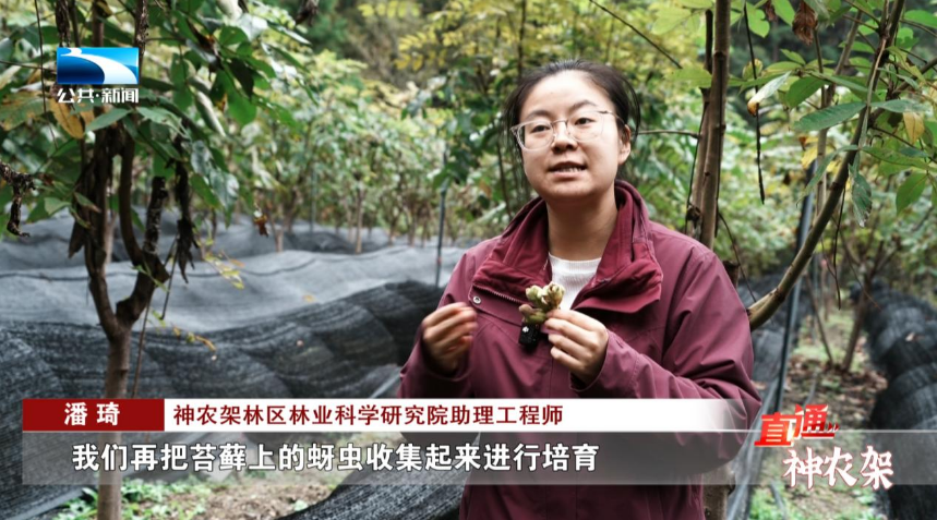 神农架林区林业科学研究院助理工程 潘琦:第二年春天,我们再把苔藓上的蚜虫收集起来进行培育,然后再挂袋到盐肤木树上,进而完成蚜虫再次在盐肤木树上的寄生,而后又形成倍子,就是这样一个循环往复的过程。