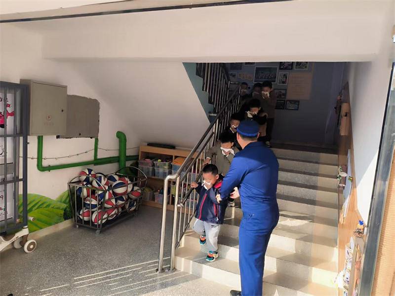 当天上午,随着警报声响起,应急疏散演练正式开始。演练模拟教学楼二楼教室突发火情。园方立即启动应急预案,拉响警报并拨打“119”报警。各班教师迅速组织幼儿用湿毛巾捂住口鼻,弯腰低姿,沿楼梯右侧有序撤离至操场安全区域。整个过程紧张迅速、井然有序,达到了预期效果。