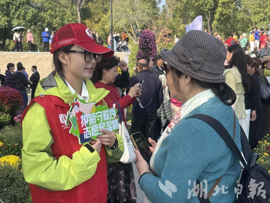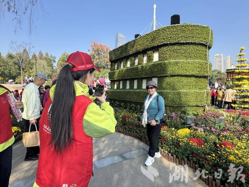 “为了这次服务,我们提前做了功课,不仅背熟了展区路线,还专门学习了武汉地标历史和菊花品种知识。”志愿者叶毕云是专业导游,她正对着一群来自随州的旅游团讲解巴公房子的百年变迁:“这栋老建筑见证了汉口开埠后的繁华,如今复刻在菊展中,就是想让大家在赏菊时也能触摸到武汉的历史脉络。”游客们听得津津有味,不时点头提问,并拉着叶毕云合影留念。