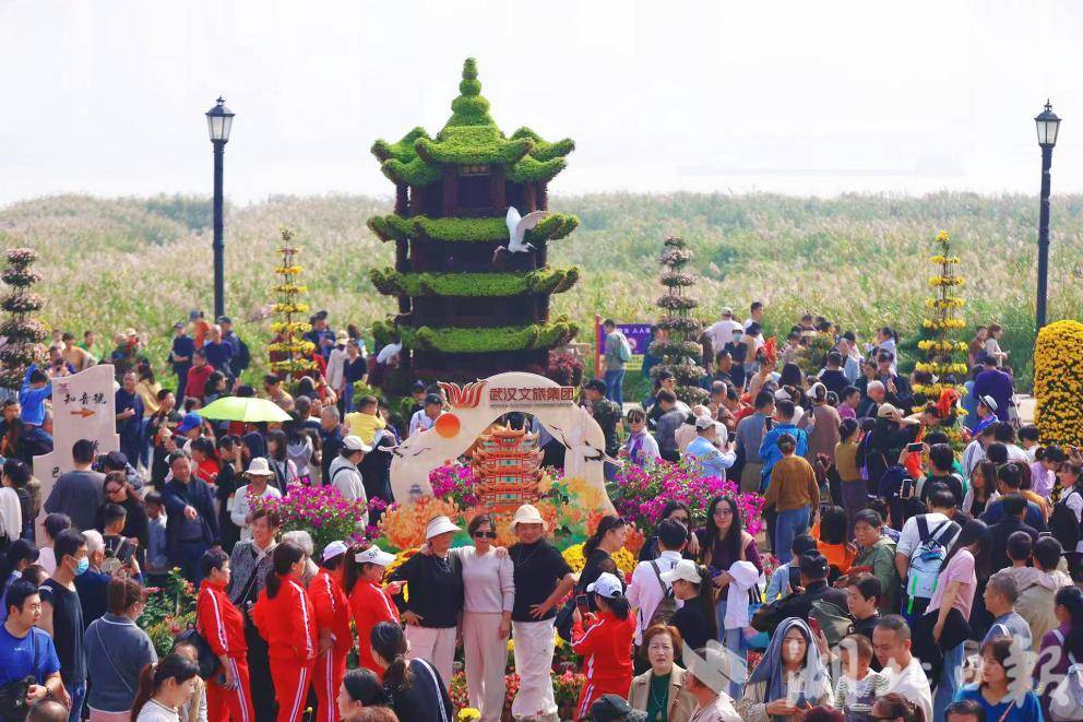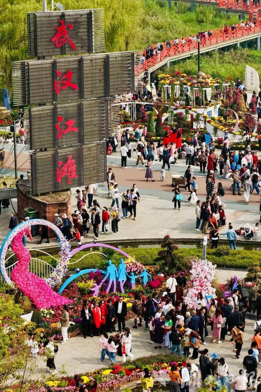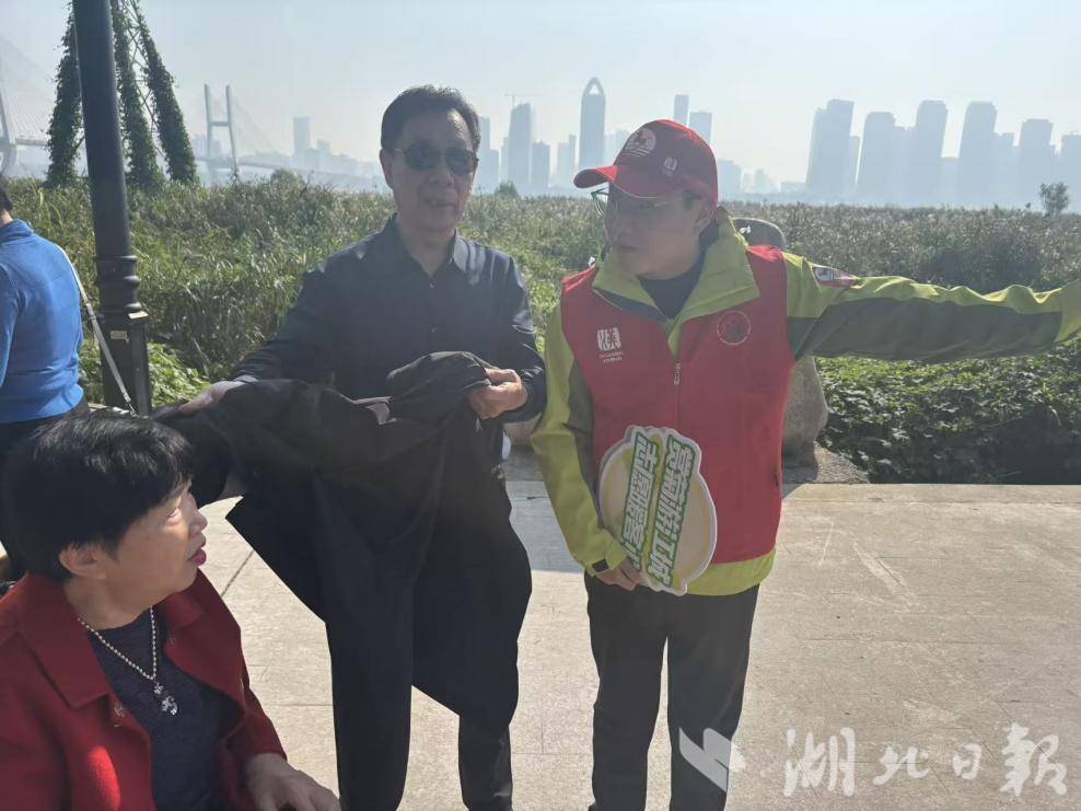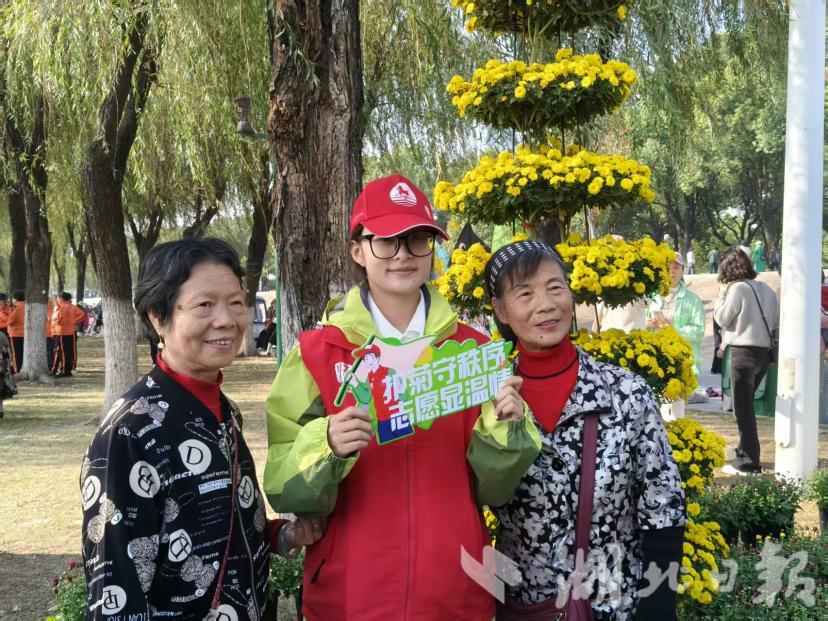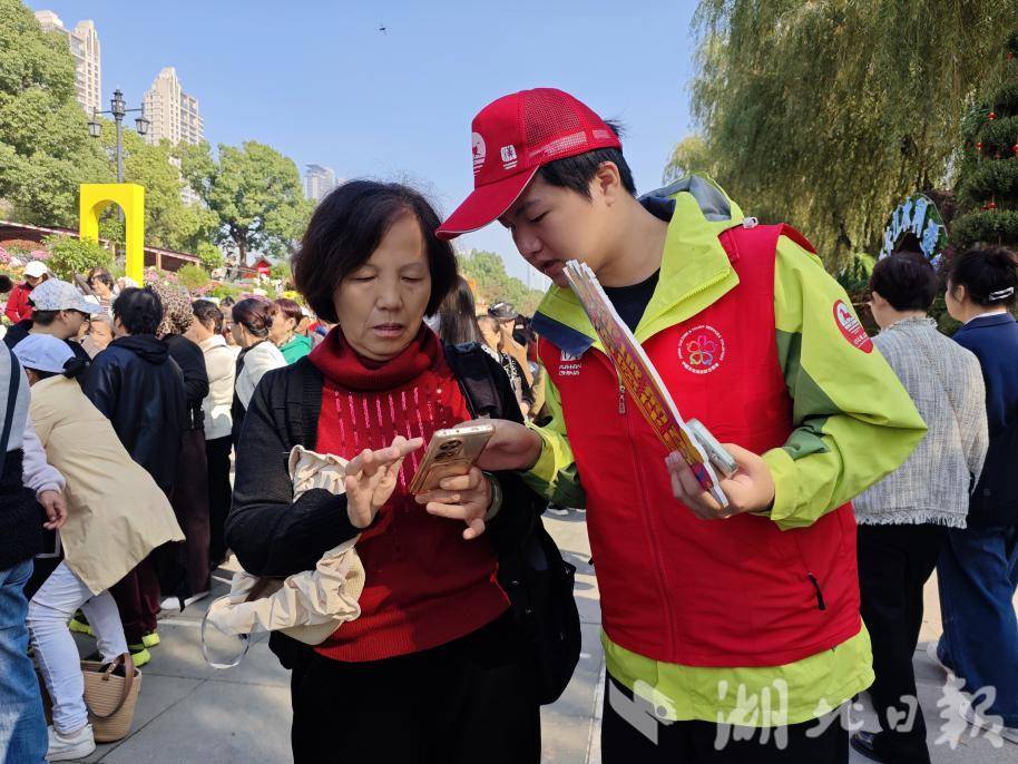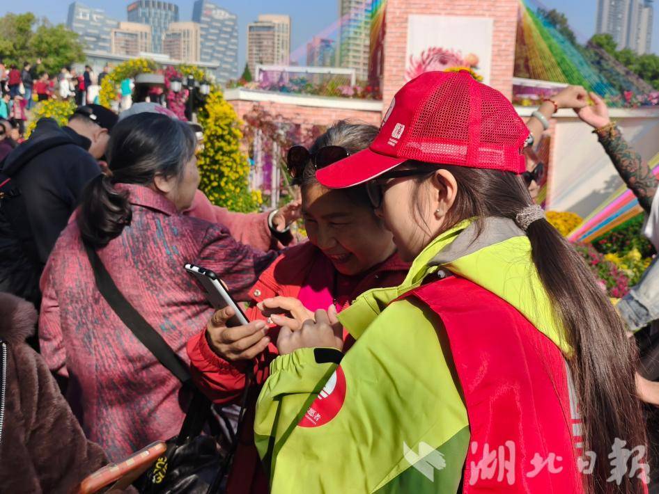 来自上海的游客陈女士带着父母赏菊,刚到江滩就遇到了志愿者指引:“我们是第一次来武汉,本来担心找不到位置,没想到志愿者体贴地为我们提供服务,还详细告诉我们武汉最佳游览路线。”她的母亲笑着补充:“刚才想拍张和黄鹤楼复刻景的合影,志愿者主动帮我们调整站位,还提醒我们注意脚下的花苗,特别贴心。”