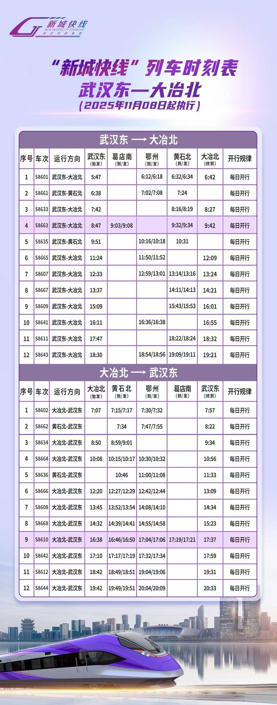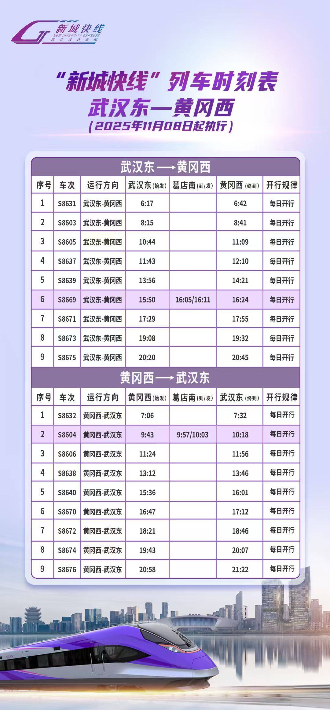 湖北日报讯 (通讯员李晶晶)从湖北铁路集团轨道运营有限公司获悉,“新城快线”葛店南站将于2025年11月8日正式开始办理客运业务,每日有4列“新城快线”列车停靠葛店南站,具体车次信息如下: