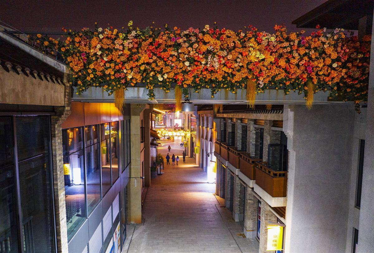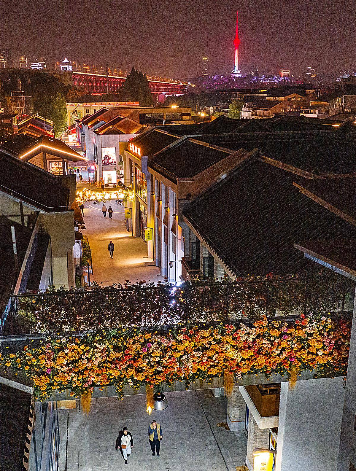 11月3日,位于武汉市武昌古城核心区域的斗级营二期,一座正在施工中的廊桥桥身上系满了繁花,站在桥上的游人,可以与黄鹤楼或长江大桥同框,成为武昌古城一处浪漫的打卡地。目前,斗级营二期已试运营,修缮后的建筑立面延续了古韵特色,打造的小微景观融入了现代元素,实现了这片区域的“美颜升级”。(湖北日报全媒记者 朱熙勇 摄)