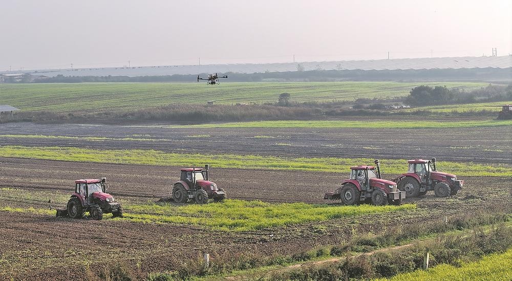 11月5日,在襄州区古驿镇的绿谷丰现代农业种植专业合作社3000亩高标准农田里,多台撒肥机、无人机、拖拉机正在撒肥、撒种、旋播。