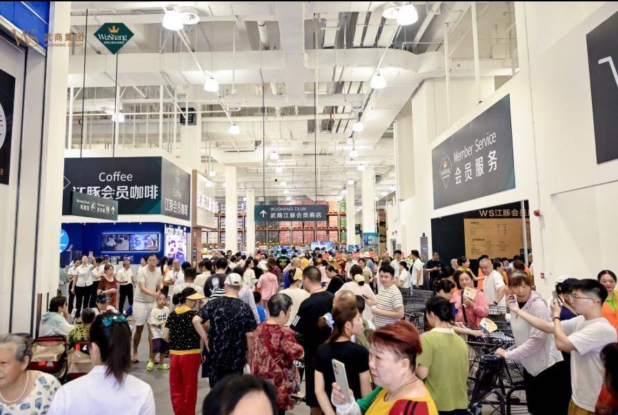 WS江豚会员店首店位于东西湖区金山大道与七雄路交汇处,营业面积超10000平方米,面向付费会员开放。在7月29日开业当天,该店客如潮涌。