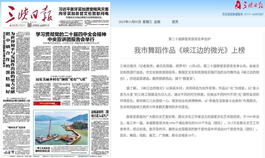 三峡日报讯(记者高然,通讯员周璇、郑梦岑)11月4日,第二十届群星奖获奖名单公布。由省文化和旅游厅选送,宜昌市文化和旅游局指导,夷陵区文化和旅游局实施打造的当代舞作品《峡江边的微光》,历经层层遴选,最终脱颖而出,摘下“群星奖”。