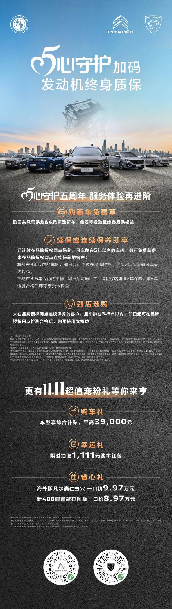 此次发动机终身质保政策的推出,不仅是神龙汽车对“良心车”品质底气的又一次证明,更是其面向未来、与用户建立终身信赖关系的战略举措。金秋11月,神龙汽车的品牌活力将持续迸发。不仅有“法式驾控体验季-赛道体验”等热血赛道活动,还将在“双十一”期间,通过“双11直播购”的直播专场,限时抽取购车抵扣券等福利,为用户带来极具吸引力的福利,让东风雪铁龙和东风标致的产品魅力,转化为用户触手可及的“高品价比”惊喜。