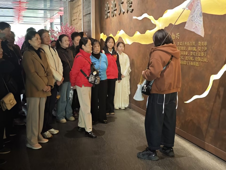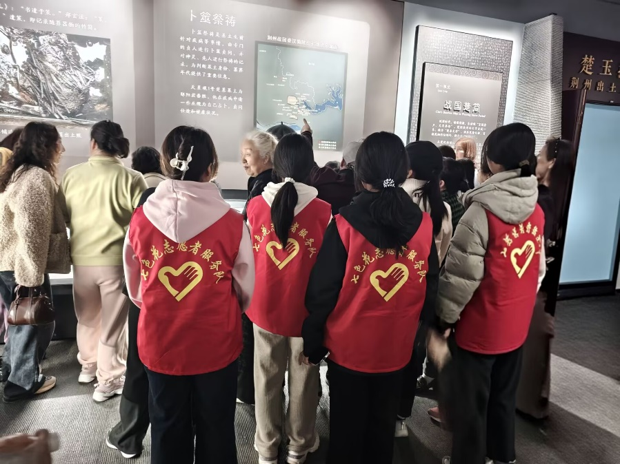 第一站来到楚王车马阵景区。在导游的带领下,老人们先后参观了车马阵展厅与出土文物陈列馆。走进车马阵展厅,跨越千年的车马遗迹震撼呈现,让老人们直观感受到东周时期楚国的强盛国力与精湛工艺;出土文物陈列馆内,青铜器的古朴厚重、玉器的温润精美吸引着老人们的目光,大家不时驻足端详,感受千年荆楚文明的璀璨。之后,队伍前往荆州博物馆。老人们在志愿者的陪伴下,参观了馆藏文物展区,从史前文明到楚越文化,从青铜礼器到书画珍品,一件件文物串联起荆州的历史脉络,让老人们深切领略到家乡文化的深厚底蕴。