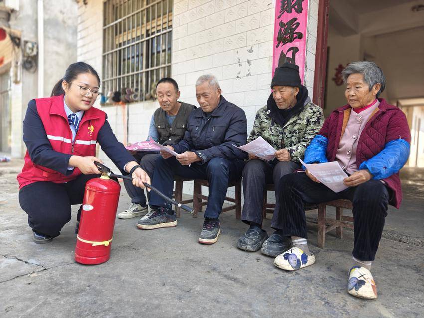 活动中,志愿者们统一着装,带着宣传物料和灭火器等实操道具,敲开一户户家门。他们用方言“拉家常”式讲解,结合真实案例,生动阐述火灾预防、扑救和逃生知识,尤其对电气线路老化、电动车违规充电等农村常见隐患进行重点提醒。志愿者们还手把手指导老人操作灭火器,牢记“提、拔、握、压”四字诀,并同步宣传高速公路沿线禁烧秸秆、禁堆易燃物等道路安全规定。