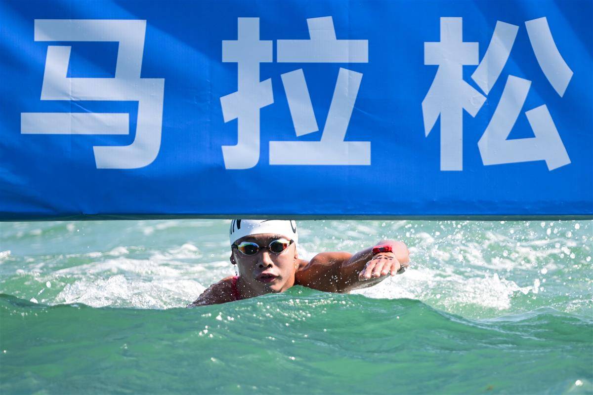 起水上岸,他高举双臂庆祝胜利,激动地与教练组成员紧紧相拥。这一刻,压力完全释放,泪水肆意流淌。“和静水湖域相比,海域马拉松的难度大了很多,而且今天的浪特别大,经常看不到方向标,只能凭感觉和意志力去游。但这也是对运动员能力的考验,在教练和团队的支持和保障下,我顶住了,做到了!”