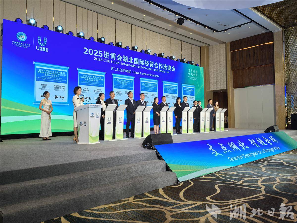 湖北日报讯(记者刘天纵、李朝霞、王艳华)五洲客商聚进博,荆楚门户迎天下。11月5日,第八届中国国际进口博览会开幕。当日下午,2025进博会湖北国际经贸合作洽谈会在上海举行,一批重点合作项目集中签约,涉及汽车制造、新材料、新能源、低空经济、光电子信息、生物医药、现代物流、现代化工等多个产业领域,共同奏响“支点湖北 智链全球”的华美乐章。