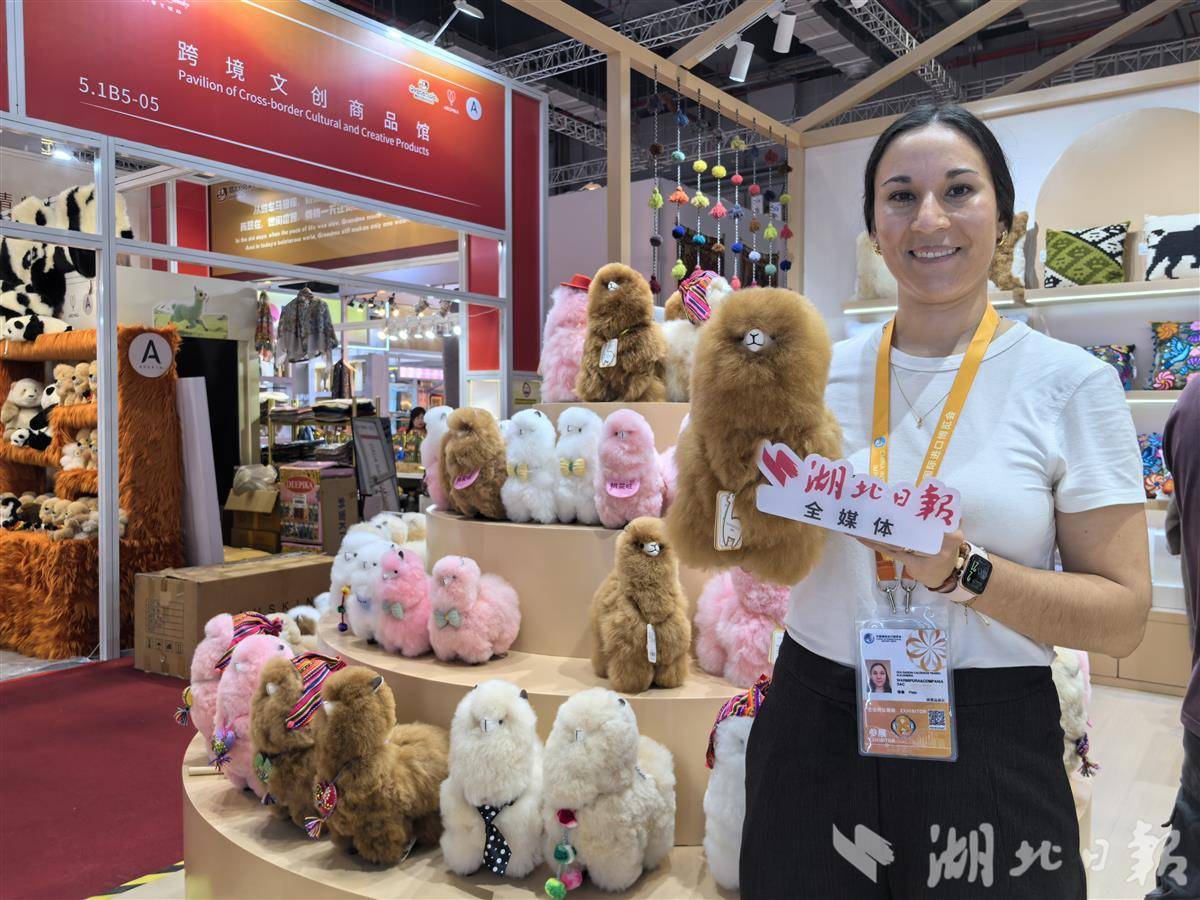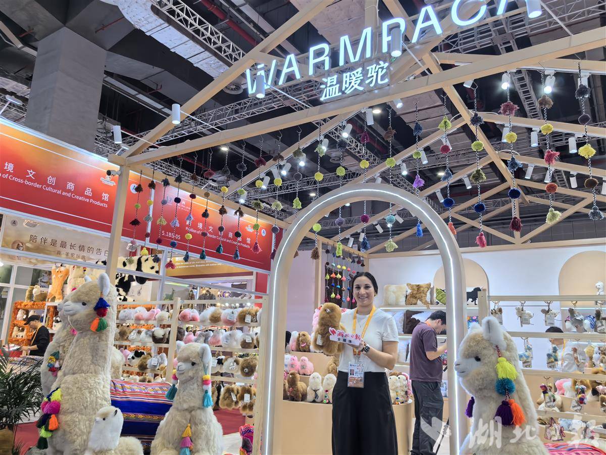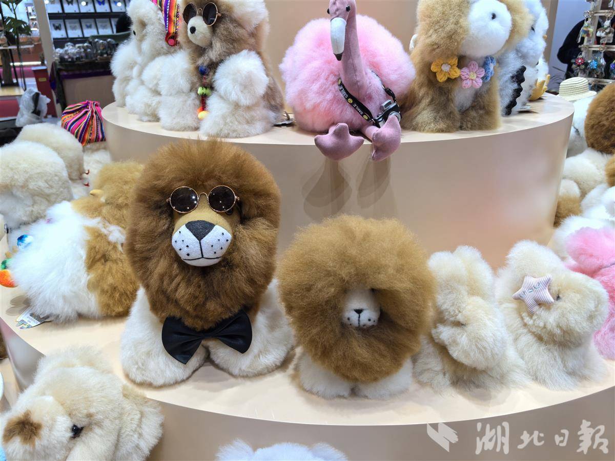在“四叶草”5.1馆消费品展区,“温暖驼(WARMPACA)”展台好似“羊驼派对”——木屋形状的吊顶上,挂着一串串南美风情的吊坠,毛茸茸的羊驼玩偶有的一人高、有的手掌大小,它们耳朵、脖子上系着五彩坠饰,让路过的国内外客商忍不住掏出手机拍照。