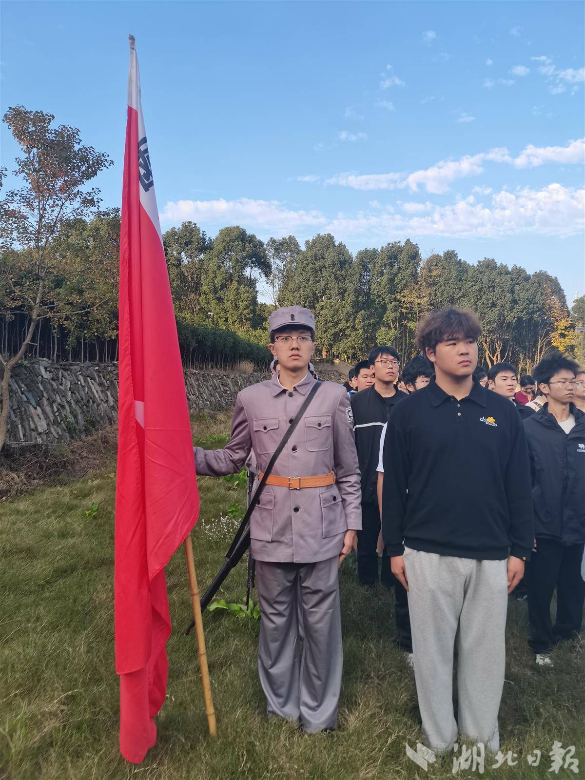 抵达新四军第五师司令部旧址纪念馆后,研学活动进入核心环节。伴随着雄壮的国歌声,全体人员肃立致敬。在纪念馆内,学子们在民兵志愿讲解员的带领下,通过文物、史料、影像等资料,深入了解新四军第五师在鄂豫边区的抗战历程,深刻感悟革命先辈的坚定信仰与牺牲精神。