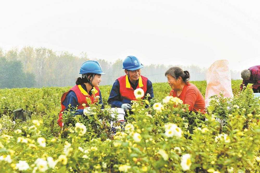 11月3日,在老河口市仙人渡镇北沟村小洋金菊种植基地,国网老河口市供电公司仙人渡供电所员工对滴灌用电设备和菊花烘干加工设备进行安全检查,并向当地村民征求用电意见和建议,宣传安全用电常识,为农村特色产业发展提供用电保障。(来源:襄阳日报 郭峰 胡培 摄)