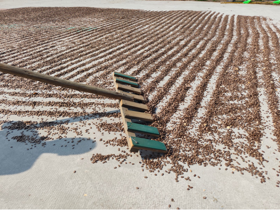“像这种泛黄、捏着发软的,就是成熟了,摘下来正好加工。”工人让明胜穿梭在瓜架下,指尖轻捏判断吊瓜成熟度,熟练地将成熟果实摘下装入竹筐。目前,小福农场200多亩吊瓜田已进入集中采收期,工人们同步将采收的吊瓜运往加工区,清洗、开果、取籽、晾晒等工序有条不紊地推进。