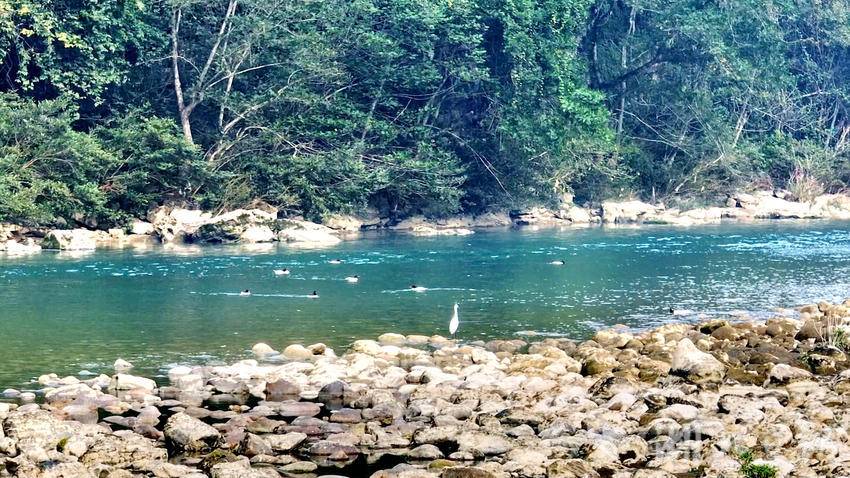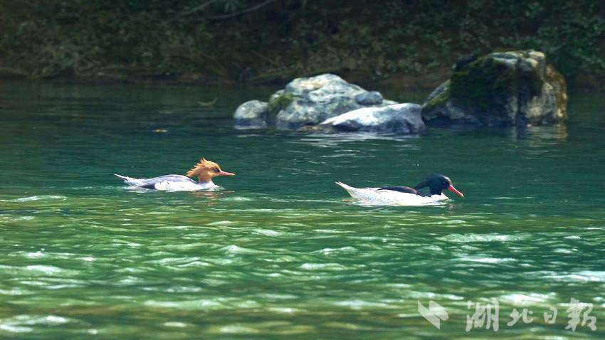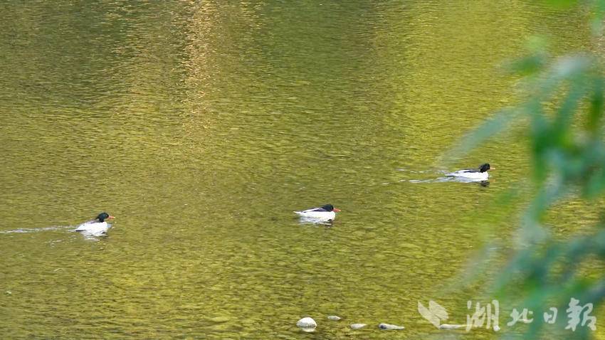 在渔洋河肖家岗村河段,这群珍贵的“客人”时而潜入清澈的水中觅食,时而振翅低飞,与周围静谧的村庄、山林共同构成一幅和谐的自然画卷。中华秋沙鸭对栖息地环境要求极为苛刻,被视为水域生态系统健康的“指示物种”。