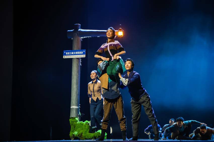 在光与影的交织中,跋涉的艰辛、等待的漫长、团聚的欢欣都被渲染得淋漓尽致。灯光设计以暖黄色光晕渲染舞台,形成“老酒般醇厚”的视觉质感,即刻升华为峡江人的精神之光。恰如峡江人“舍小家为大家”的奉献精神——每一盏灯都是微光,但汇聚起来便成为照亮万家灯火的炬火。
