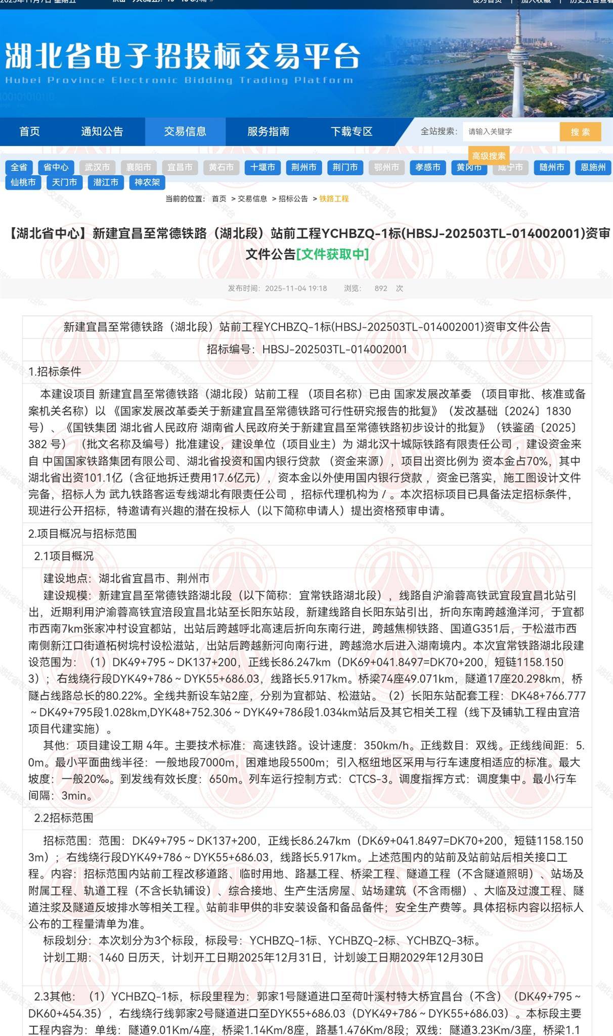 湖北日报讯(记者胡祎)近日,湖北省电子招投标交易平台发布信息显示,宜昌至常德高铁湖北段建设已启动招标。招标单位为武九铁路客运专线湖北有限责任公司。