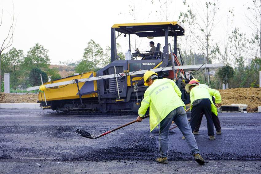 当天下午,施工现场热火朝天,在高速公路服务区,工人们与机械协同作业,有的摊铺沥青路面,有的忙着绿化种植,有的加紧围墙建设,全力冲刺项目交工建设。