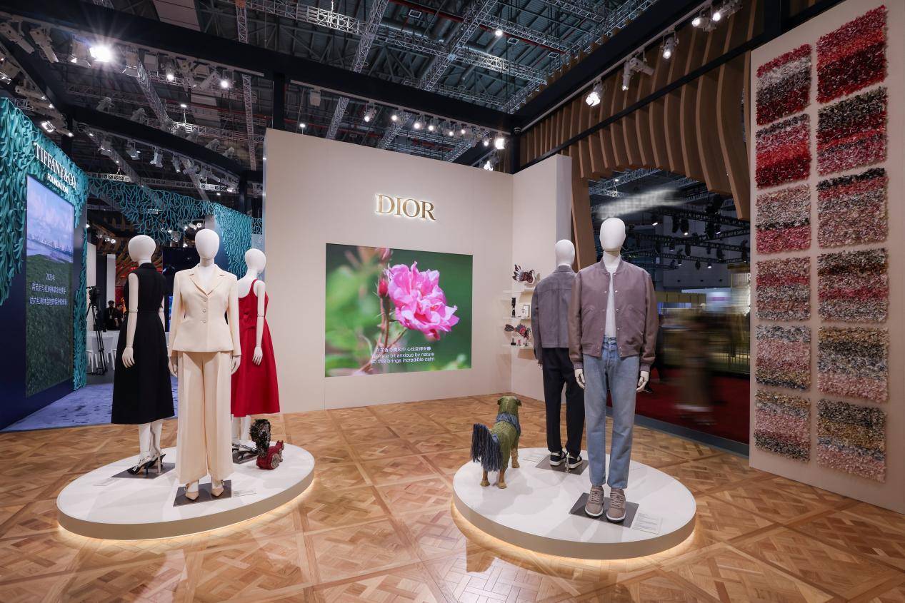 在展区中央,迪奥在本次进博会上带来了多款以可持续理念设计的产品,涵盖男装与女装成衣系列。这些作品选用经认证的可持续面料,遵循严格的环境与社会标准,从原料、工艺到制作流程皆力求降低对生态的影响。与此同时,展区亦呈现一系列迪奥美妆的可持续创新成果,包括迪奥魅惑唇膏系列、迪奥旷野系列、迪奥花秘系列的可替换装设计。通过可重复使用的瓶身与补充装系统,减少一次性包装废弃物,以创新方式延长产品生命周期,诠释迪奥可持续之美的当代愿景。