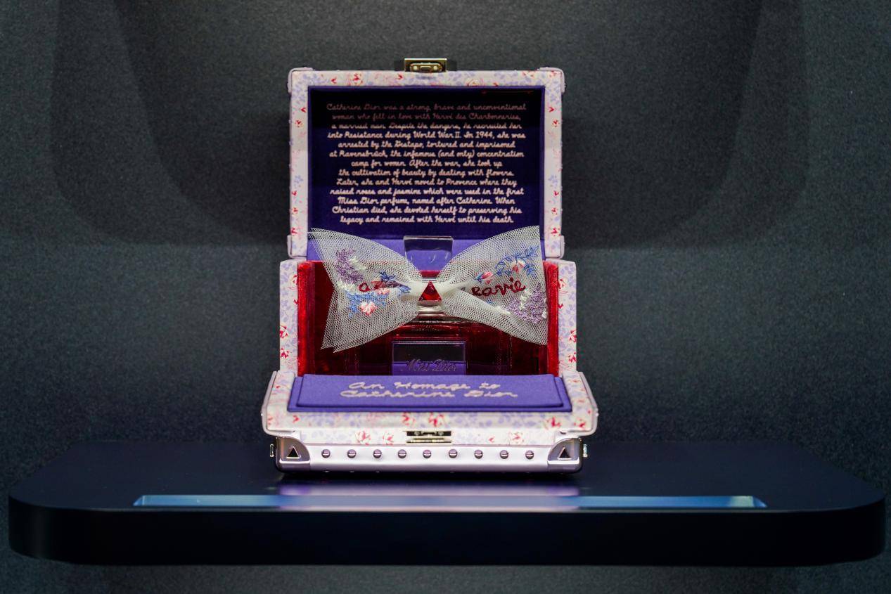 最后,在本次进博会中,还特设了一座“LVMH 迷你博物馆”,集中呈现集团旗下品牌的经典佳作与创新匠艺。 迪奥于此呈献两款代表作品:其一为中国艺术家鞠婷赋新演绎的经典LADY DIOR手袋,该作品灵感源自动态艺术的表现原理,由起伏波动的面板构成,营造出动感十足的律动效果与视觉错觉,专为2025年度的“DIOR LADY ART #10”艺术家限量合作系列打造;另一件为美国艺术家朱迪•芝加哥(JUDY CHICAGO)为迪奥小姐香水创作的香氛收藏箱,箱体饰以繁花图案与春意色彩,致敬迪奥先生的妹妹、迪奥小姐香水的永恒缪斯卡特琳娜•迪奥(CATHERINE DIOR)。