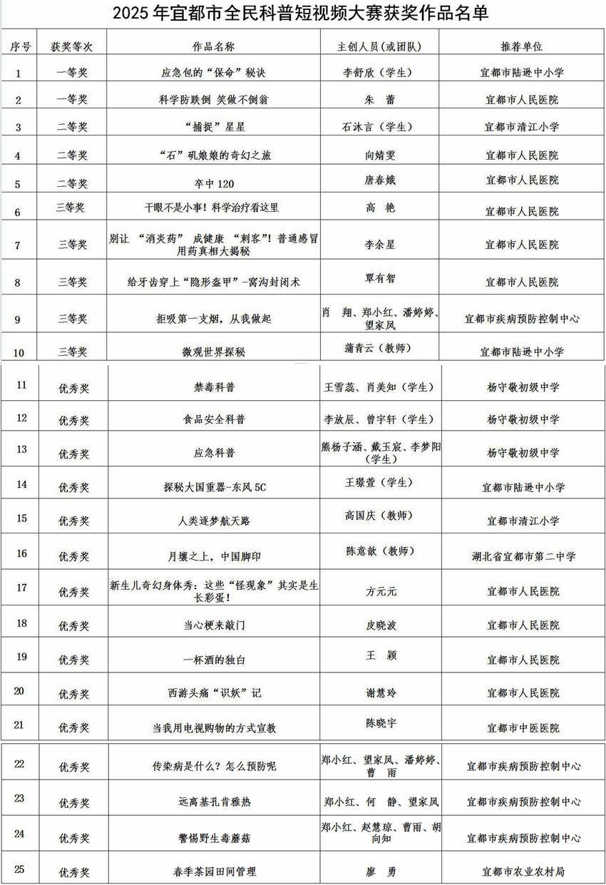 据悉,本次大赛一、二、三等奖获奖作品将通过市融媒体中心平台展播,并被推荐参加省、宜昌市级科普短视频评选。