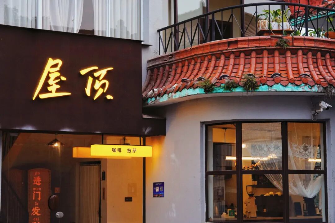 靠近五柳公园北门,褐色招牌上,明黄色的“屋顶”二字在阳光下格外惹眼。暖黄色灯笼悬在门侧,抬头就能看见二楼天台——红褐色瓦片与公园门楼连成一片,蕨类从瓦片缝里钻出来,几盆绿植探着脑袋,像在跟路过的人打招呼。这是李奎的屋顶咖啡,也是枝江人的治愈角落。