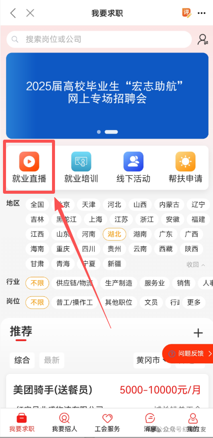3. 点击“直播招聘”即可进入招聘专场,可在地区选择“湖北省-黄冈市”查看到本场直播招聘会。