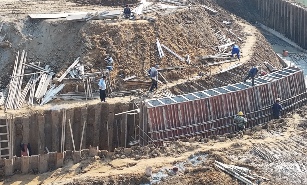 11月5日,位于红安县高新区恒大板块的1号渠排水防涝工程正稳步推进。施工现场,重型打桩机将一道道钢板桩精准就位,夯实着工程基础;与此同时,工人们正在已成型的混凝土挡墙上进行精细的模板支护作业,标志着项目主体结构施工进入关键阶段。