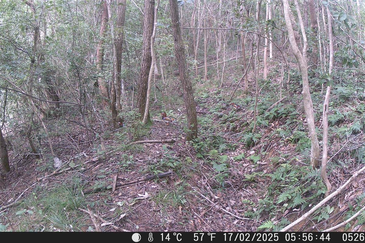 红安天台山森林公园的红外相机则捕捉到中国特有鸟种——白冠长尾雉的优美身影。画面中,这只国家一级保护鸟类在林间从容穿梭,华丽的羽色搭配修长独特的尾羽,尽显珍稀鸟类的灵动风姿。作为野外种群数量极少的濒危物种,白冠长尾雉对栖息环境要求严苛,此次在天台山的明确记录,不仅填补了当地该物种影像资料的空白,更为评估其种群分布范围、保护现状提供了扎实的科学依据。