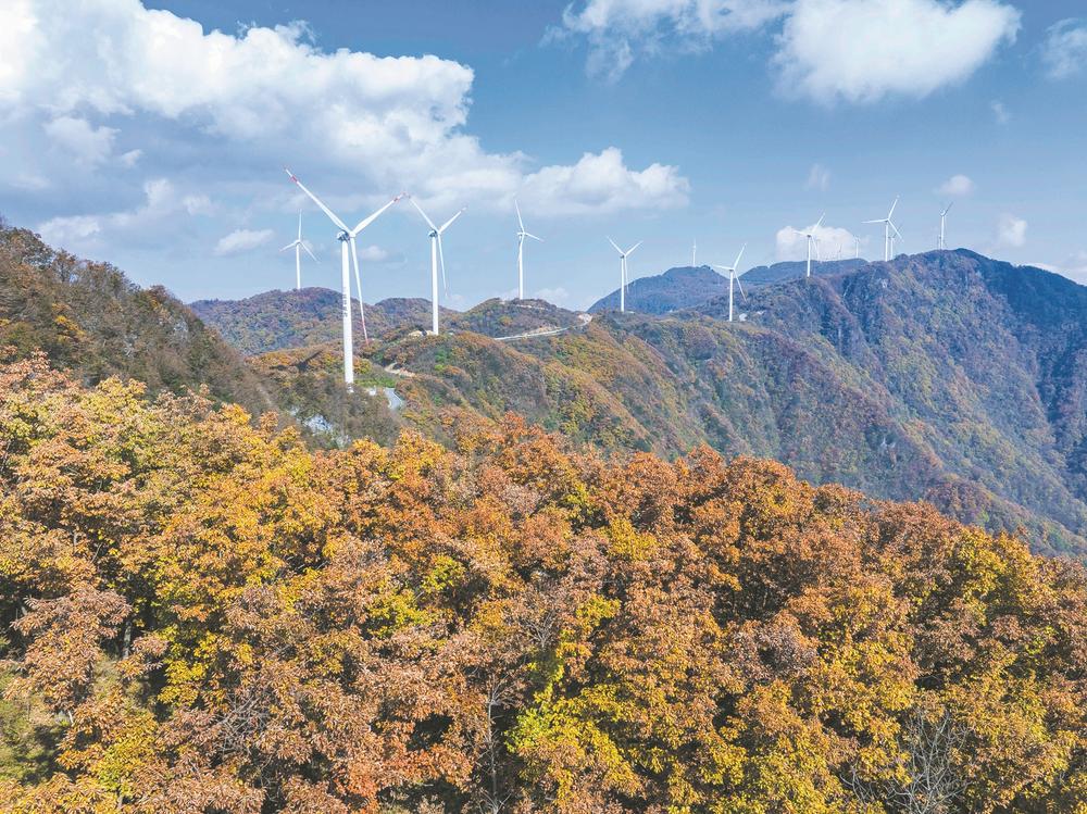 11月4日,在保康县后坪镇横冲风力发电场,一台台风力发电机矗立在群山之巅,与色彩斑斓的树木相映成趣,成为一道亮丽的风景线。