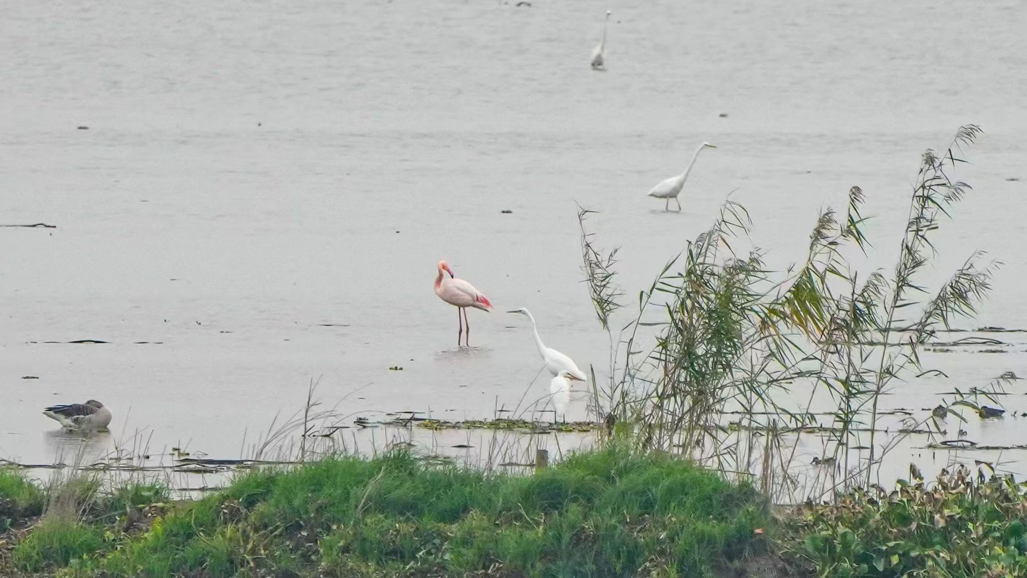第四次现身沉湖湿地的大红鹳。彭憬 摄