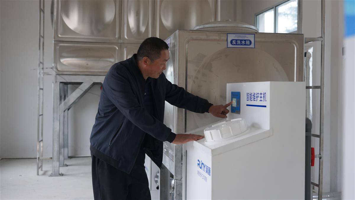 村委委员李小平在瓦窑水厂察看设备运行情况。(受访单位供图)