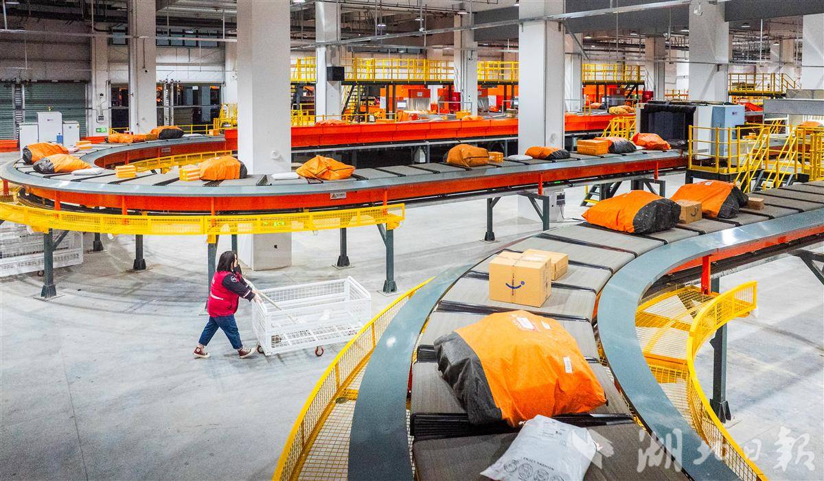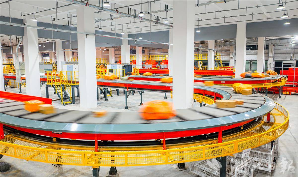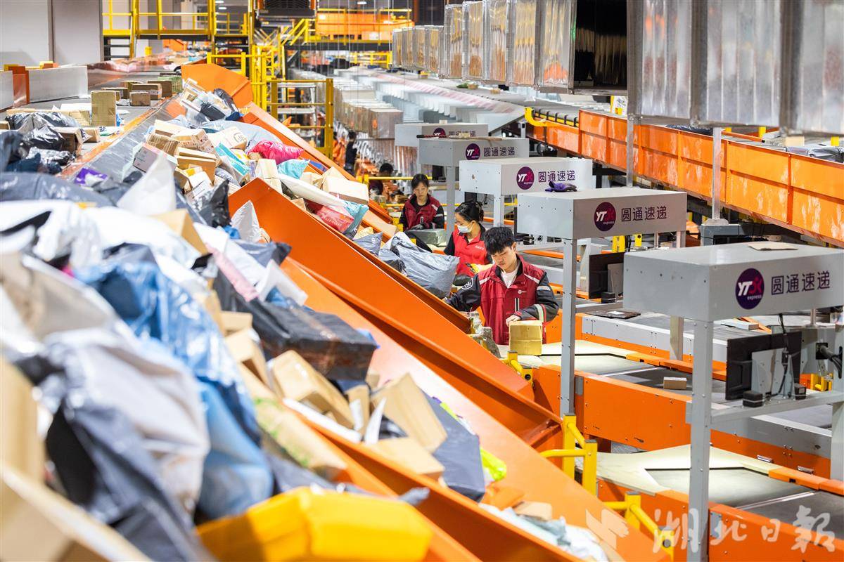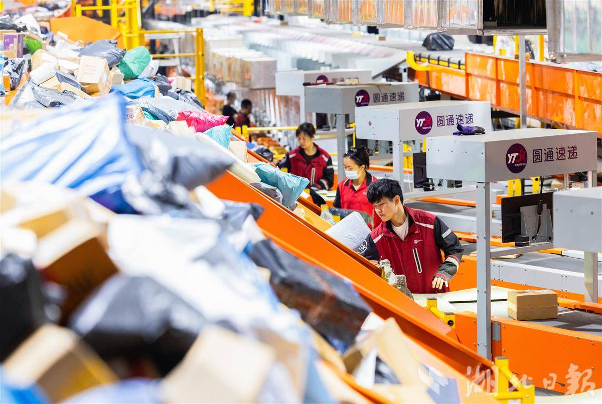 11月7日晚,鄂州葛店经开区圆通智创园灯火通明,自动化分拣系统高速运转,数以万计的快递包裹在此精准分流。