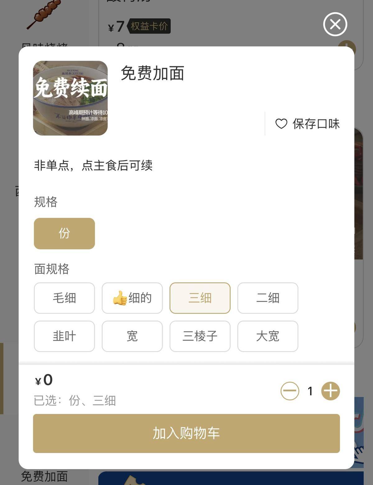 马记永小程序中“免费加面”选项。