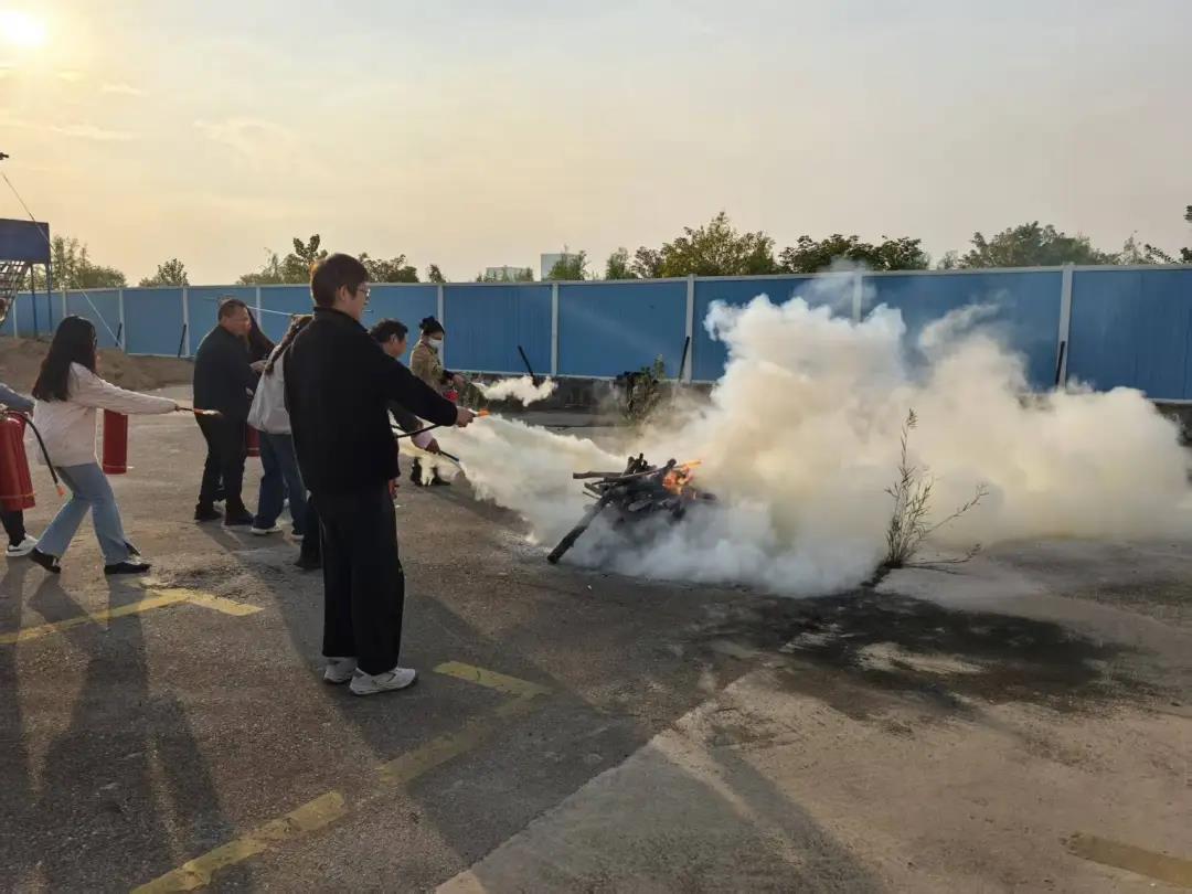 在办公楼前广场,消防教官组织开展消防设备实操作业,重点讲解了干粉灭火器的工作原理、适用范围及“提拔握压”四步操作法,并指导员工逐一进行灭火实操体验。