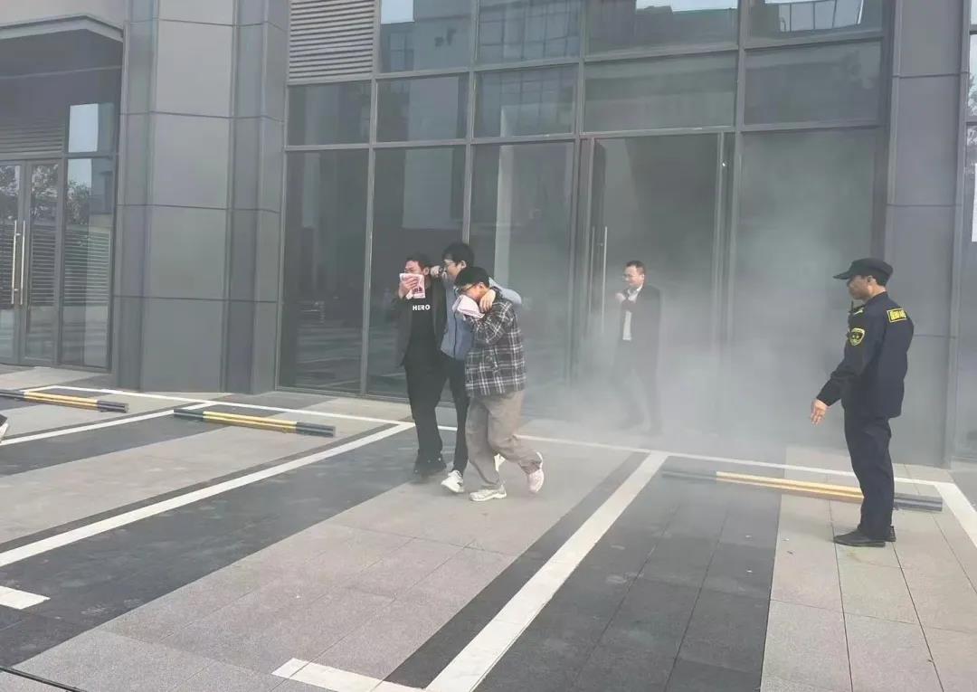随后,疏散救援应急演练拉开帷幕。演练模拟办公区因电器短路突发火情,现场烟雾弥漫,警报声骤然响起。在物业工作人员的迅速引导下,参训员工用湿毛巾捂住口鼻、弯腰低姿,按照预设疏散路线有序撤离。演练结束后,消防教官对疏散效率、人员配合及操作规范进行了专业点评,并针对细节环节提出了切实可行的改进建议,进一步优化了应急响应流程。