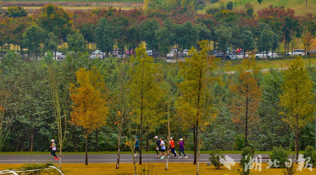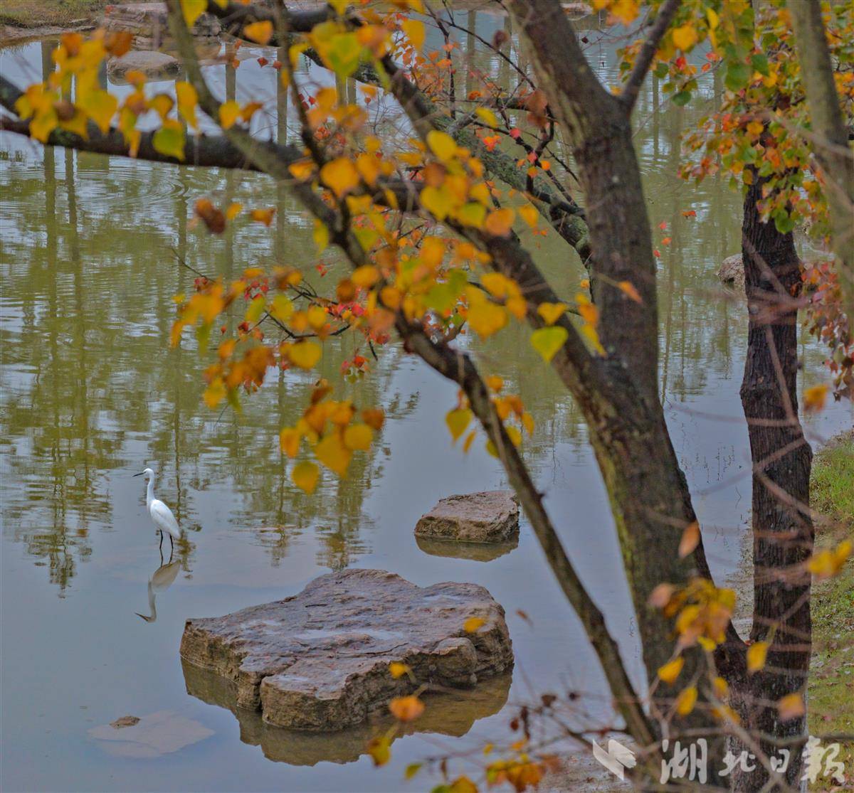 11月9日清晨,宜昌卷桥河湿地在绵绵秋雨中更显静谧雅致,浓郁秋意浸润着每一处景致。湿地内的乌桕树褪去翠绿,枝叶间缀满嫣红,如天然织就的暖色锦缎,成为秋日里最亮眼的景致。晨雾尚未散尽,不少市民已循着清新空气前来,在红枝掩映的步道上跑步锻炼,脚步声与秋雨滴落树叶的轻响交织成趣。卷桥河岸边,白鹭舒展双翼,或在水面低飞盘旋,或驻足浅滩觅食,悠闲姿态为这幅秋日晨景图增添了灵动生机。(湖北日报全媒记者 刘曙松 摄)