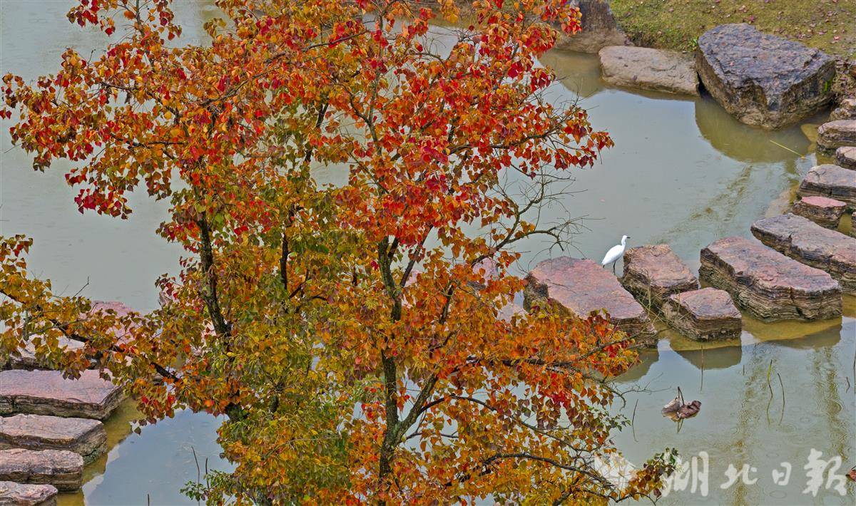 11月9日清晨,宜昌卷桥河湿地在绵绵秋雨中更显静谧雅致,浓郁秋意浸润着每一处景致。湿地内的乌桕树褪去翠绿,枝叶间缀满嫣红,如天然织就的暖色锦缎,成为秋日里最亮眼的景致。