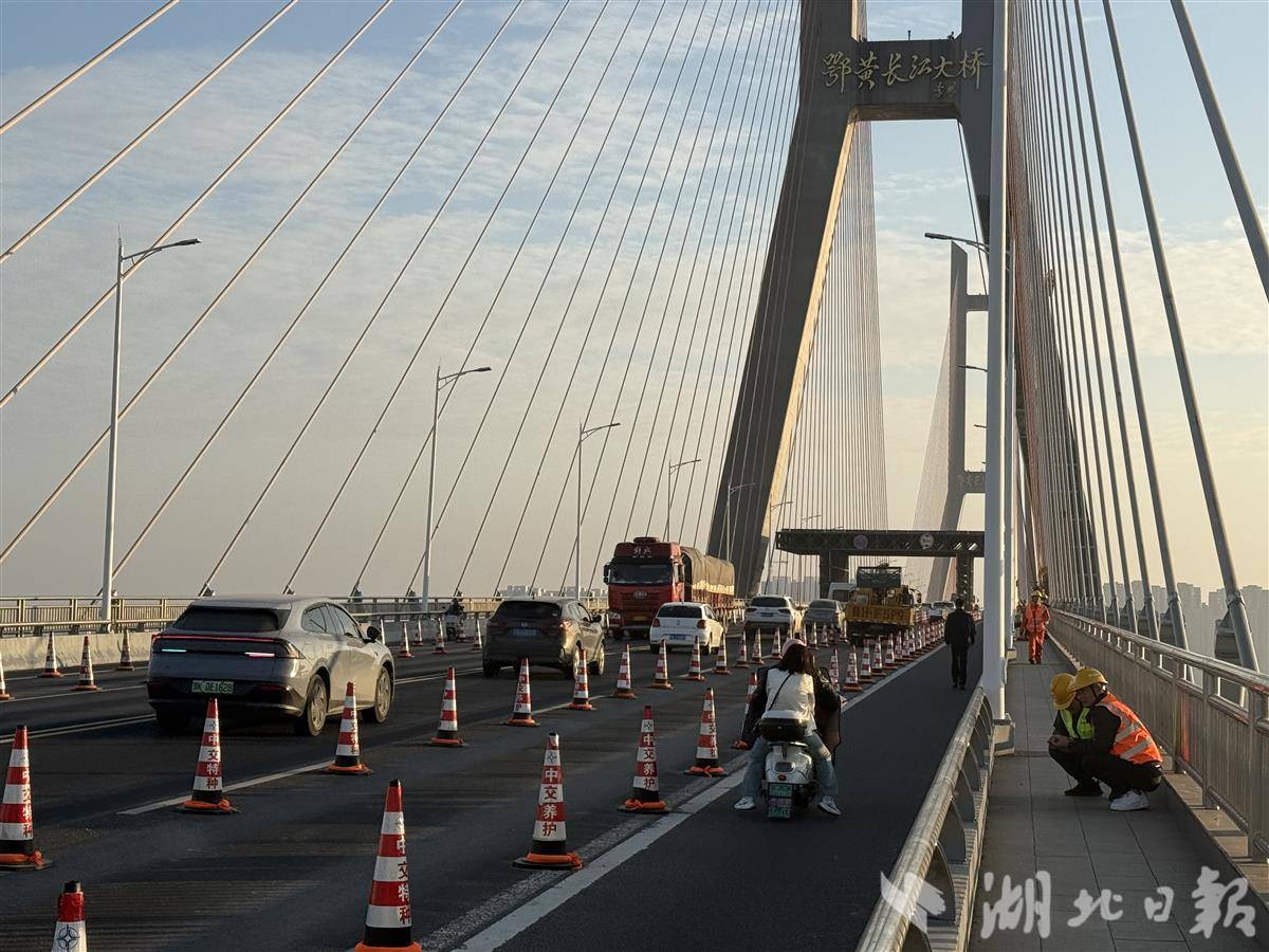 鄂黄长江大桥部分路面封闭,便于对斜拉索和主塔实施维保作业。(湖北日报全媒记者 李源 摄)